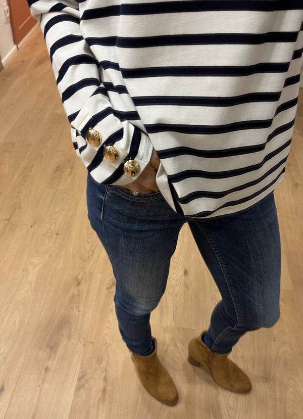 T-shirt marinière à manches longues en coton - Encolure ronde - Patte de boutonnage au poignet - Boutons dorés - Longueur depuis l'épaule de 60 cm pour une taille S