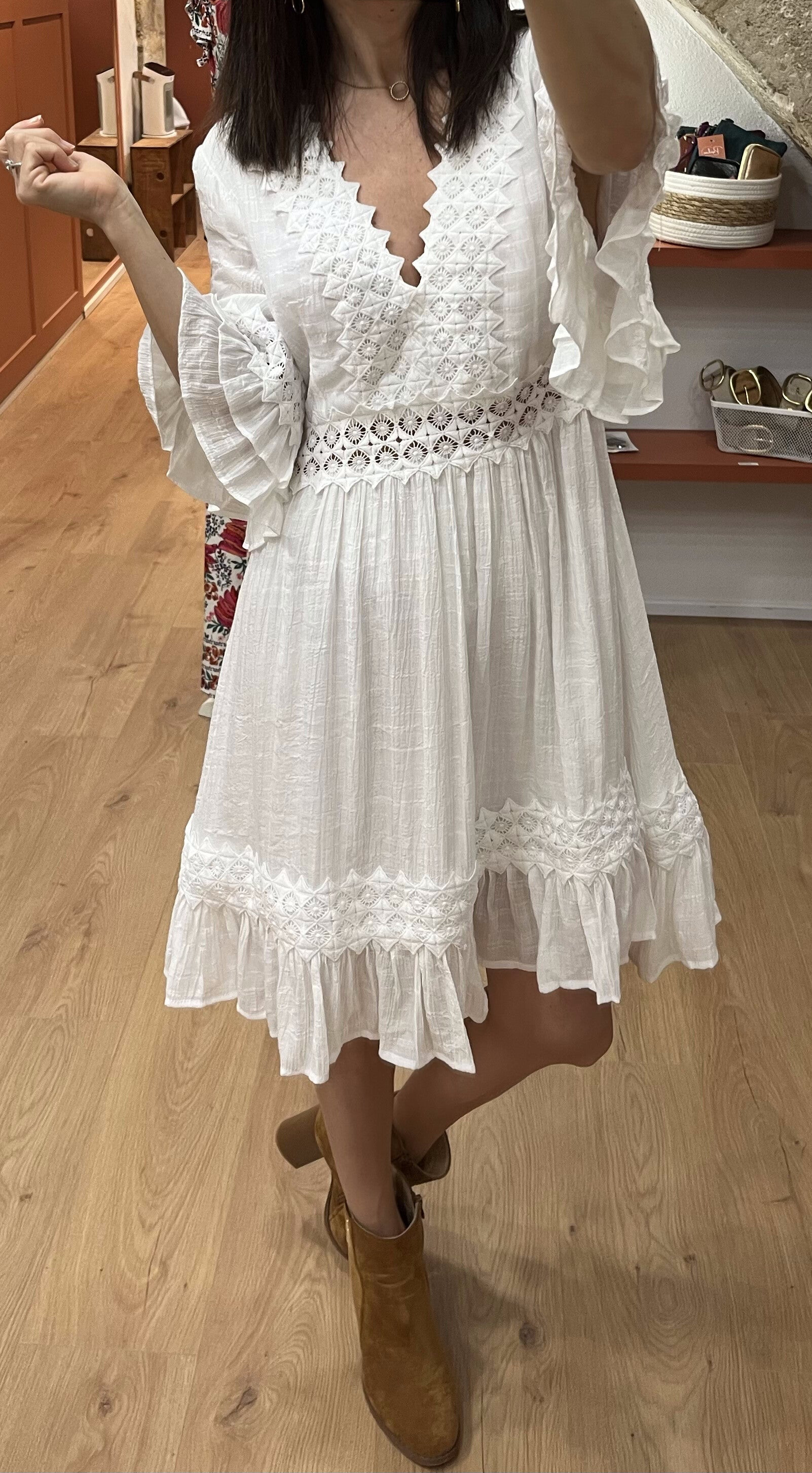 Robe blanche col V et manches mi-longues (niveau coudes) avec de jolis détails.