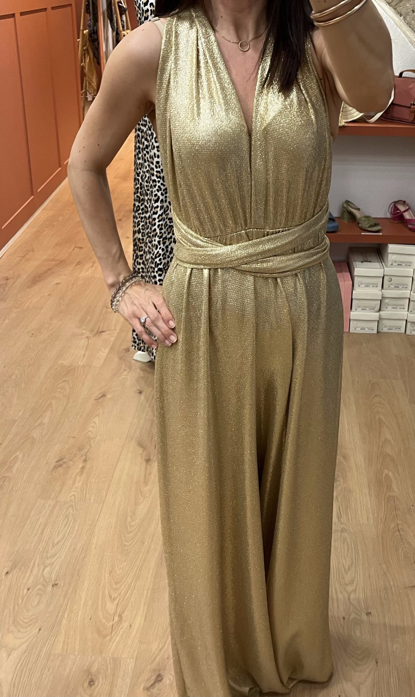 ROMANE GOLD est une combinaison dos nu élégante et sexy, parfaite pour une soirée ou une cérémonie.
